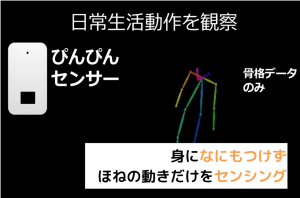 「ぴんぴんセンサー」は骨の動きの情報を収集し、数値化した姿勢動作を解析します。顔や身体の画像は必要ありません。もちろん加速度センサーがついたブレスレットなども不要です。