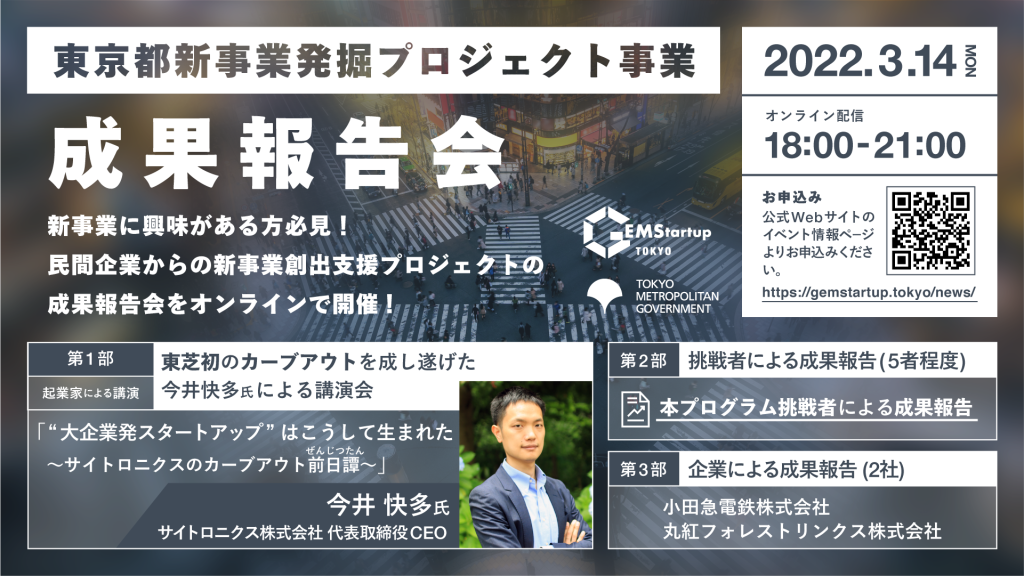 東京都は大企業等の民間企業で培われたノウハウやアイデアを起業や新事業創出に結びつけるための取組みである「新事業発掘プロジェクト(GEMStartup TOKYO)(以下、本事業)」の成果報告会を、2022年3月14日(月)にオンライン配信で開催いたします。本事業では、分野を超えた起業家やベンチャーキャピタリスト、その他各分野のプロフェッショナルの方々に協力をいただき、民間企業の社員がビジネスアイデアを事業化するための支援を実施しております。