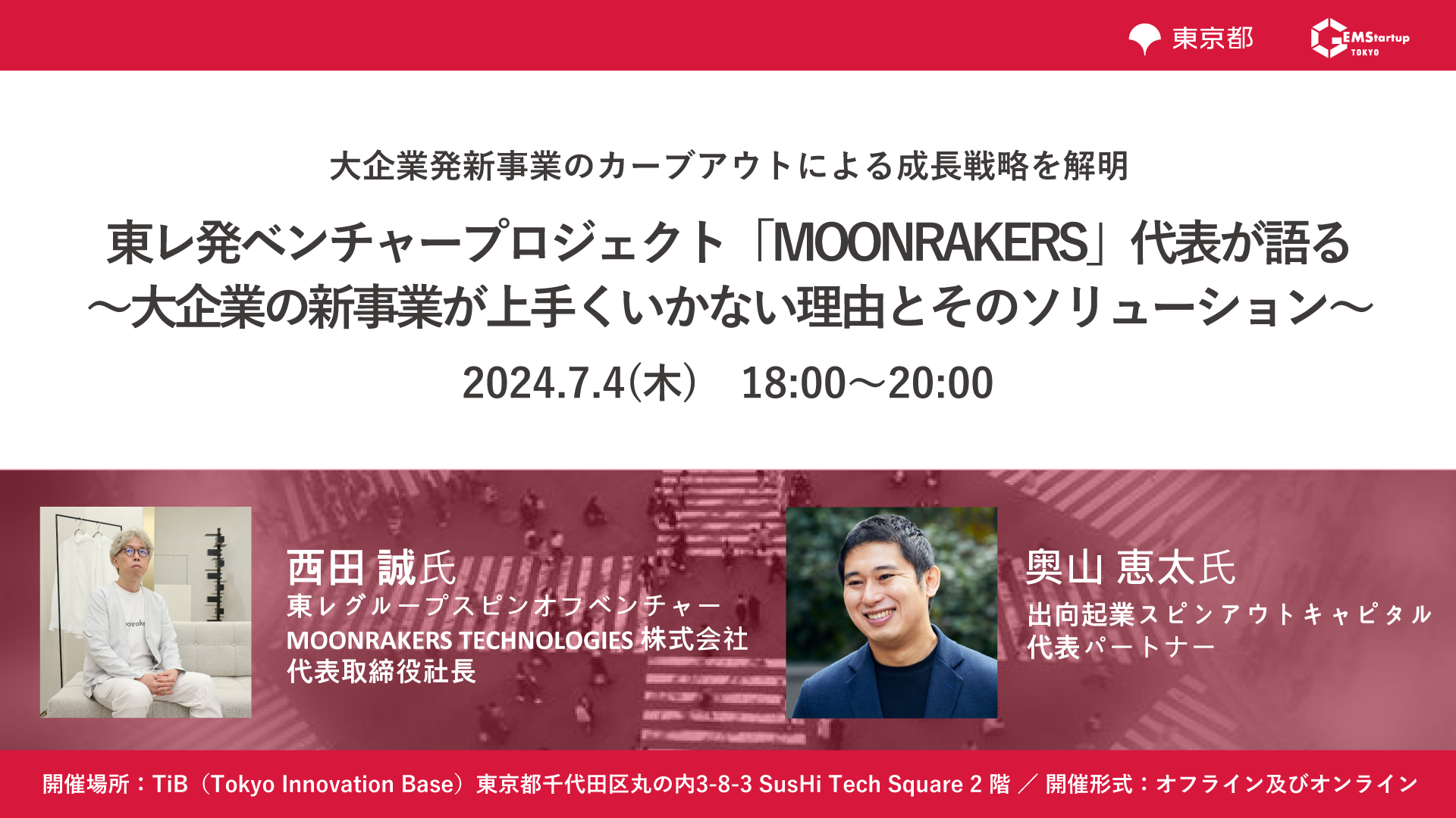 「大企業が変われば日本が変わる」出向起業制度で日本を再び世界のリーダーに。東レ発、今話題の「MOONRAKERS」西田誠氏と、出向起業制度の立役者「出向起業スピンアウトキャピタル」奥山恵太氏が登壇。