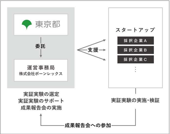 本事業で採択されたSUは、東京都(運営事務局)の支援のもと、自らの成長に資する仮説検証や社会実装に向けた実証実験を実施します。実施スキームは、以下の通りです。