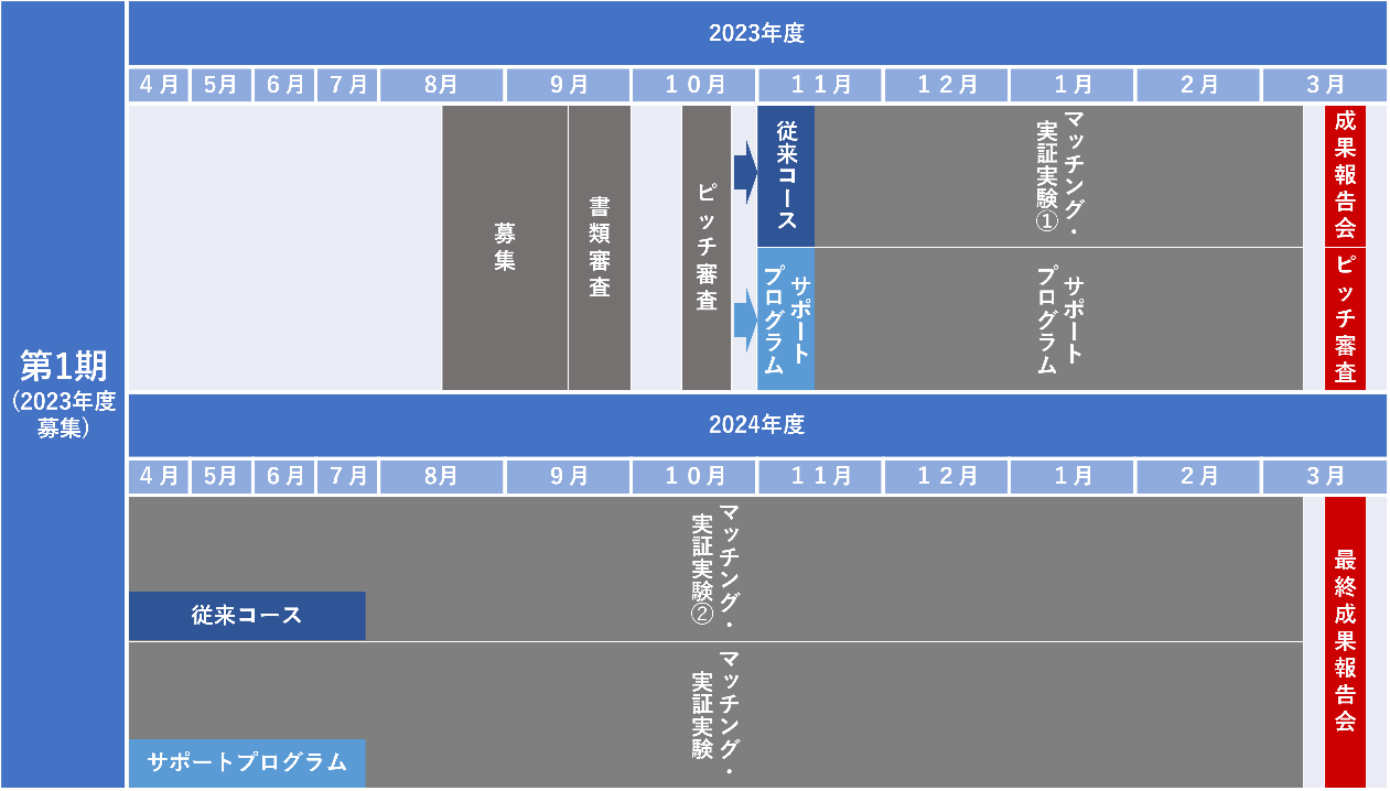 本事業では、第1期(2023年度募集)と第2期(2024年度募集)に分けて募集を行い、2期合計20~25社程度の採択を予定しています。